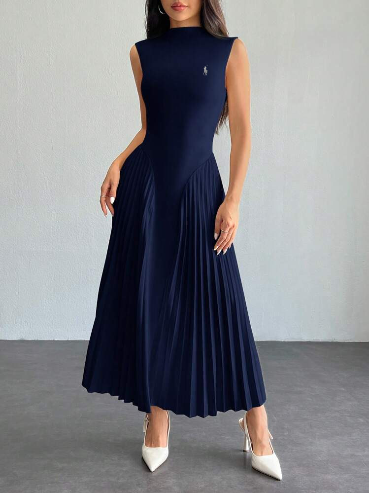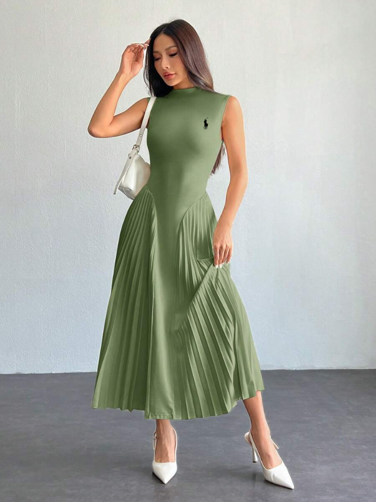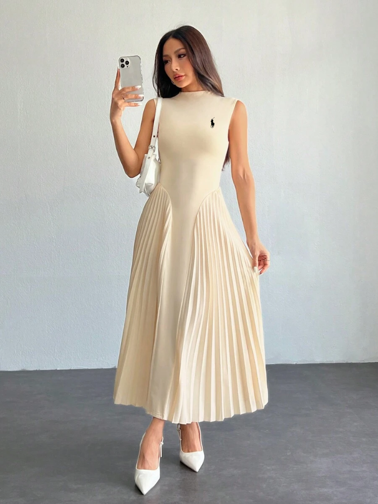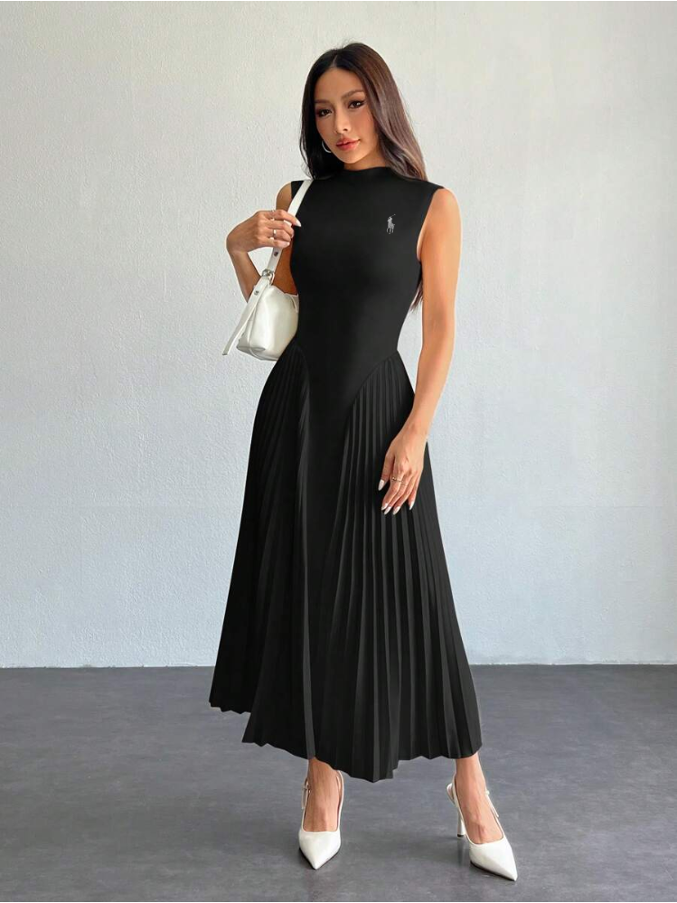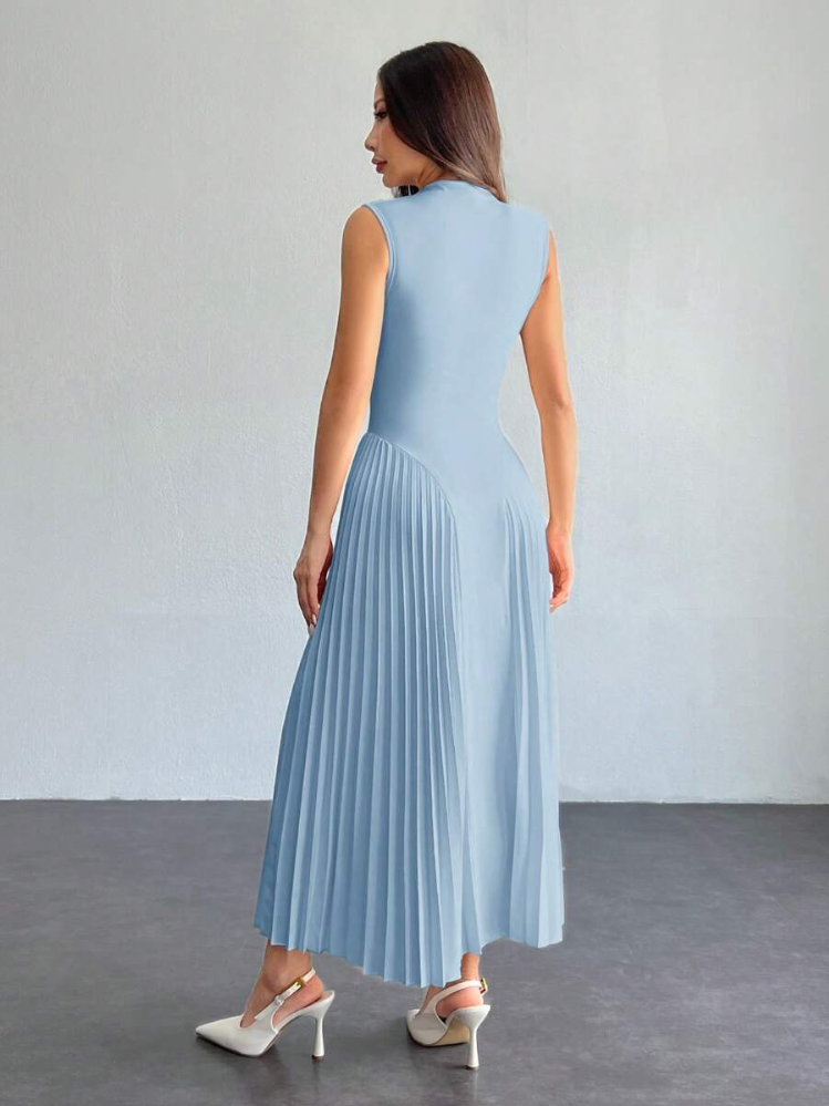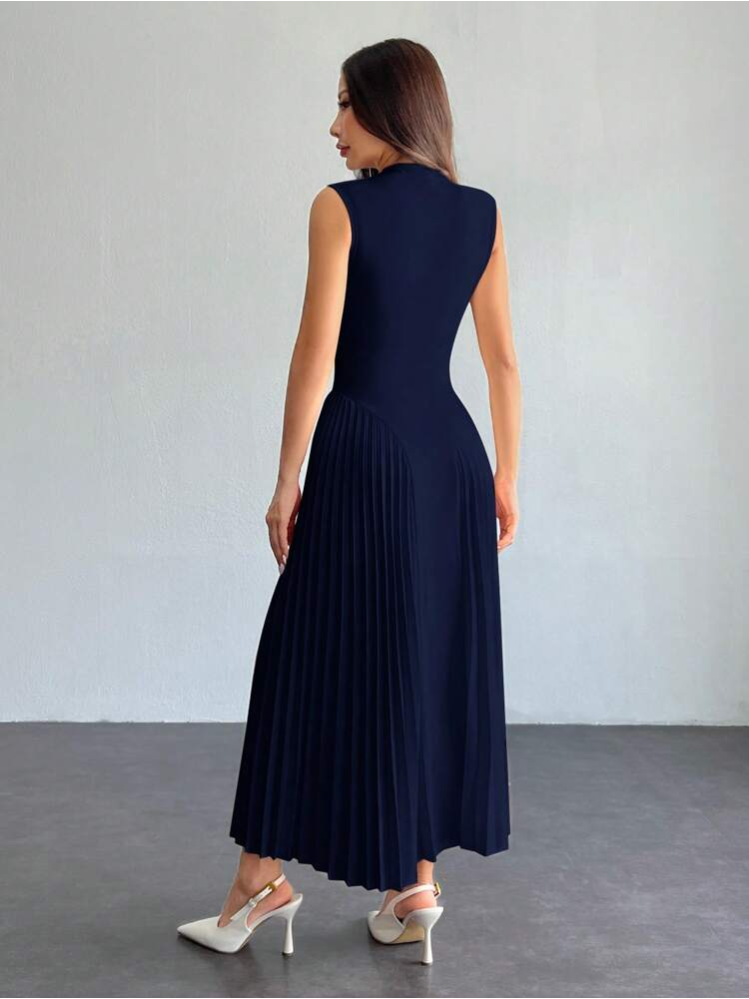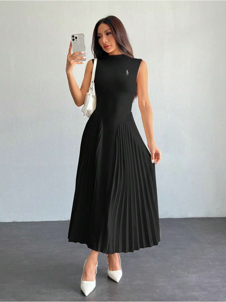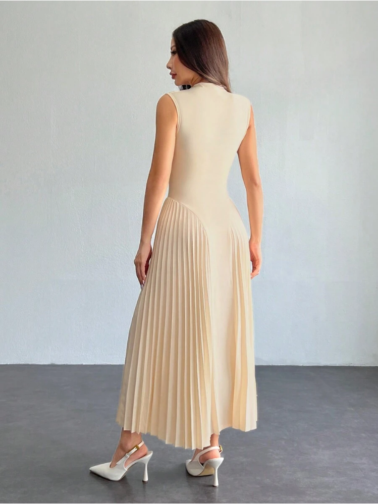 The sleek sleeveless bodice enhances the silhouette with flawless tailoring, flowing seamlessly into a luxuriously pleated skirt that moves with subtle drama at every step.